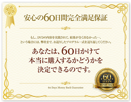 DVDをお手に取っていただき、今よりも技術的なスキルが上がらない、または実践したにも関わらず効果がみられないということであれば、 弊社の商品配送日から60日以内(必着)であれば、全額返金させていただきます。