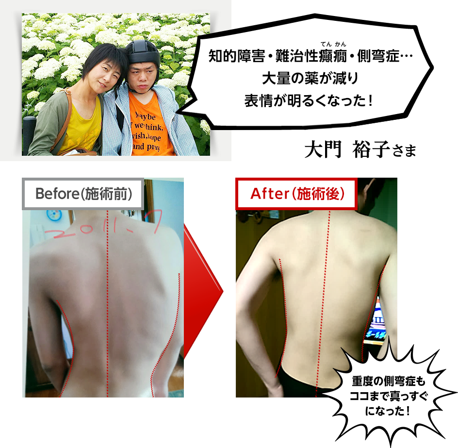 先生の治療を経て、今では側弯が真っすぐになり、さらに大量に服薬していた薬を、大幅に減らすこともできました。