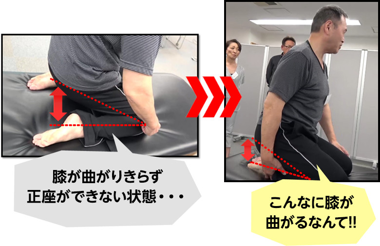 膝が曲がらずに正座ができない状態でしたが、みるみる膝の可動域が回復して正座ができるようになりました。