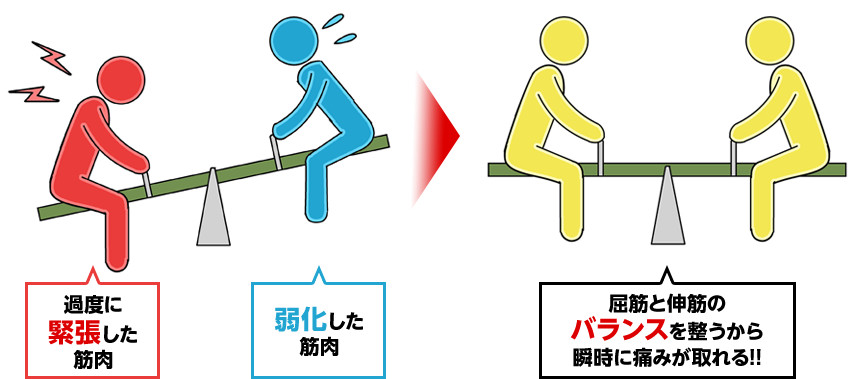 過度に強くなっていた筋肉の緊張を取り除き、弱まっていた筋肉を活性化させることで筋肉の強弱のバランスは均一に戻っていくので、その結果、長い年月をかけてバランスが崩れた患者さんの身体は元の状態に戻っていくのです。