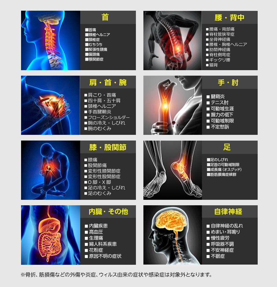この手技で対応できる症状は次の通りです。