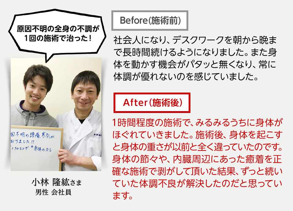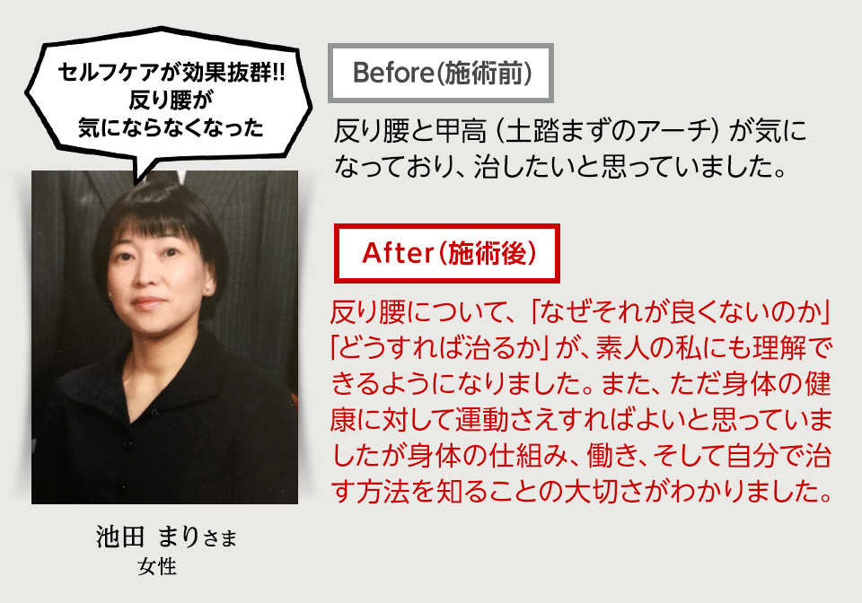 そして施術を受けると左足のキツさがなくなり、たまに感じていた腰痛も一切なくなったのです。