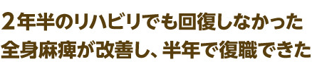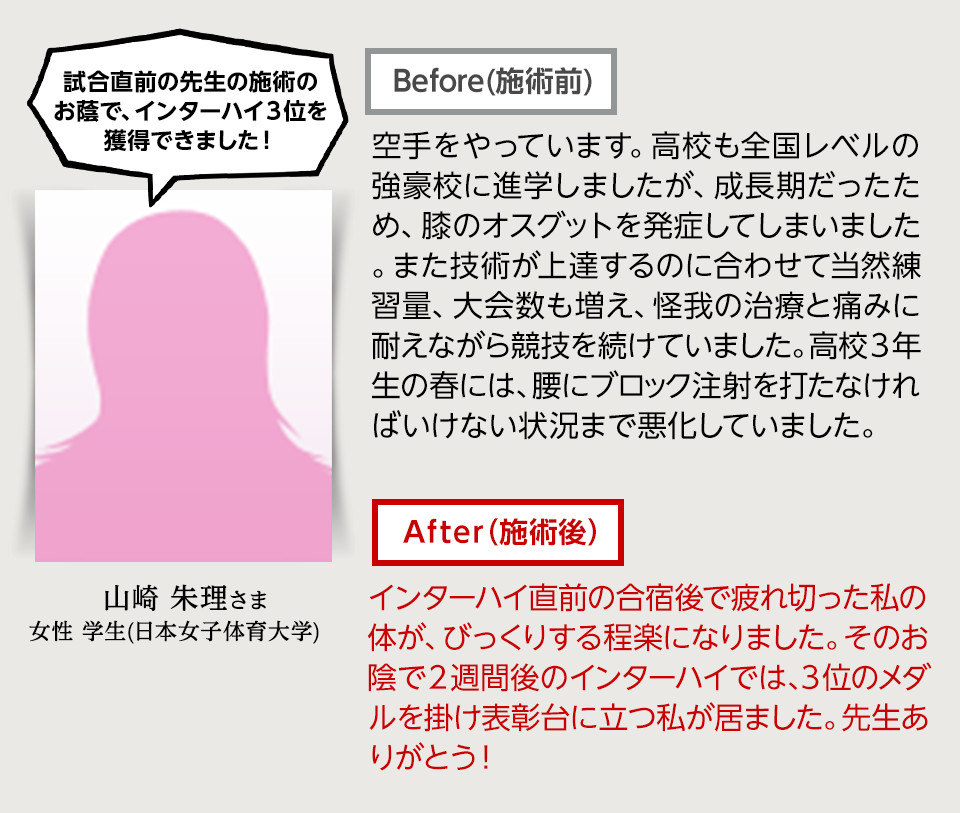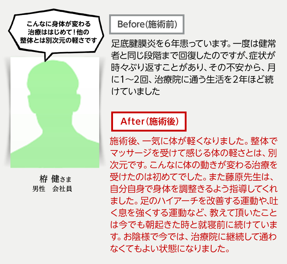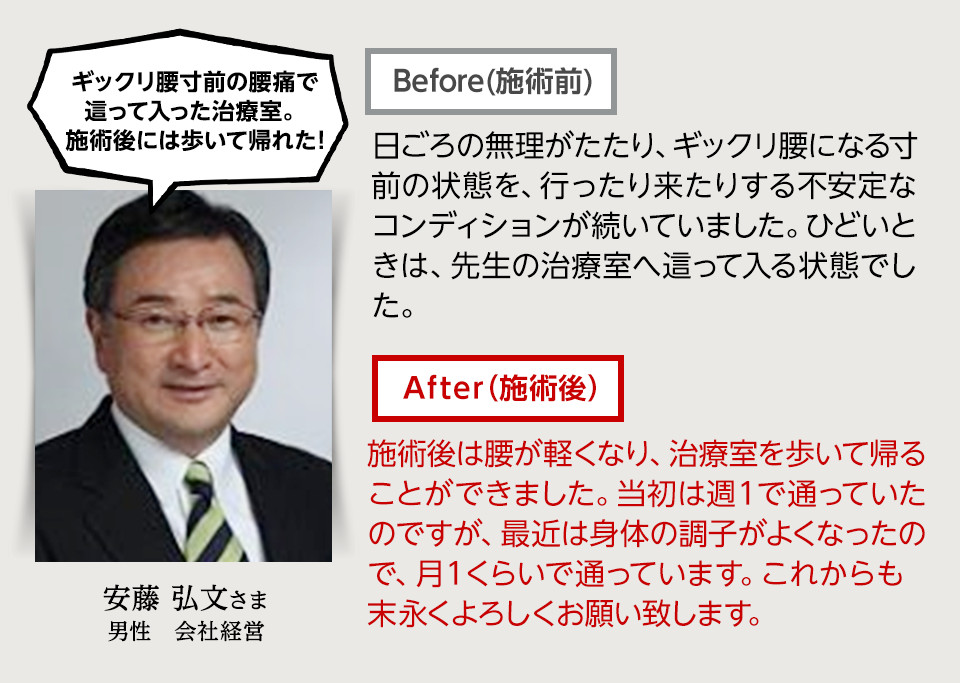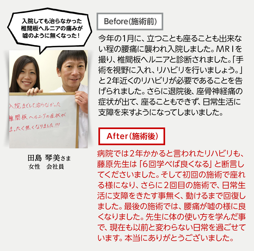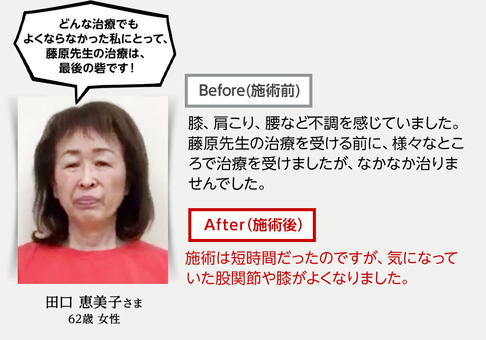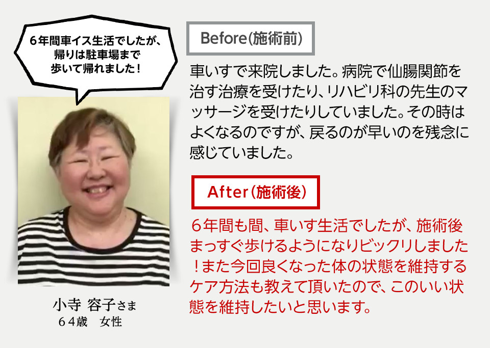 2~3回の施術で杖なしで歩けるようになり、半年後には絶望的だと思っていた医師の仕事に復職することができました。この施術は他にはない独特の方法であり、大変効果があると毎回感じています。