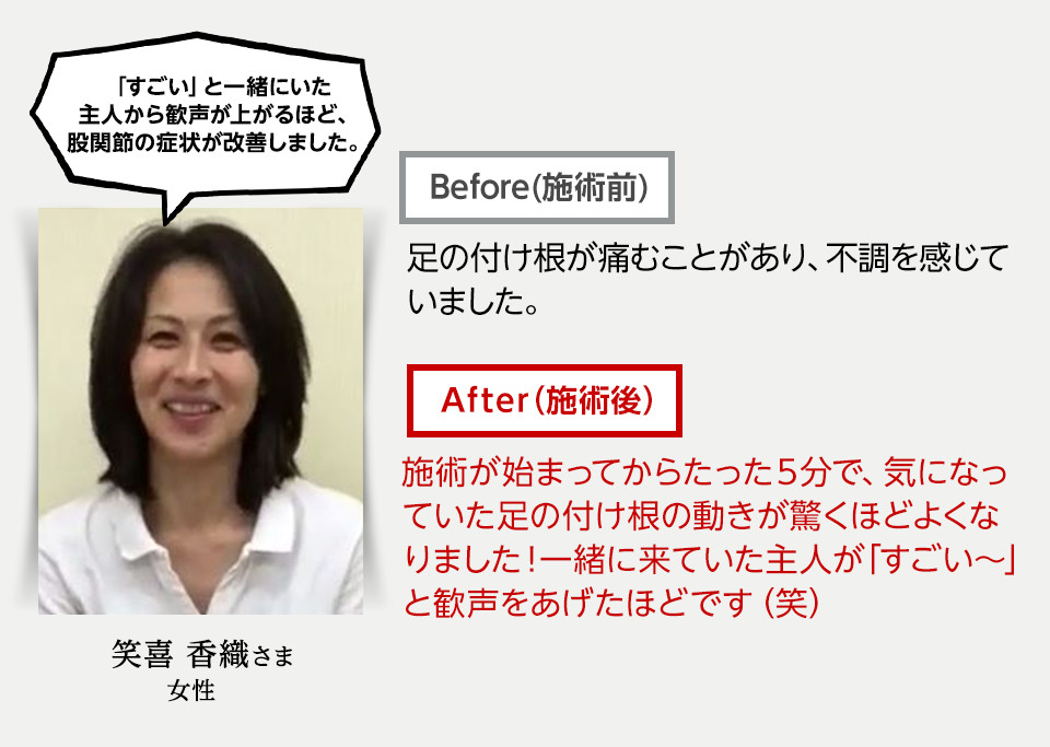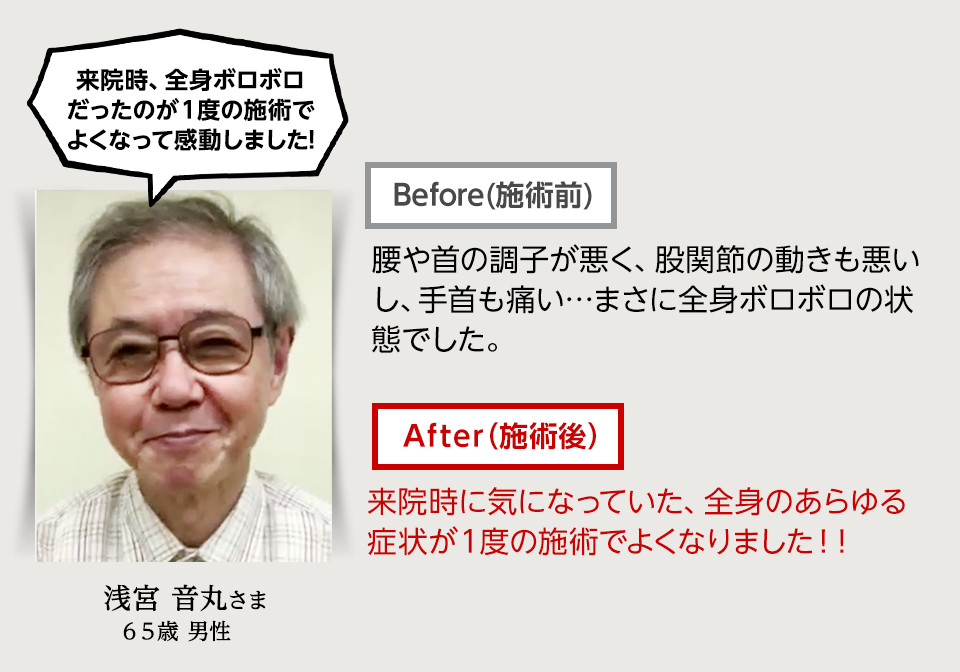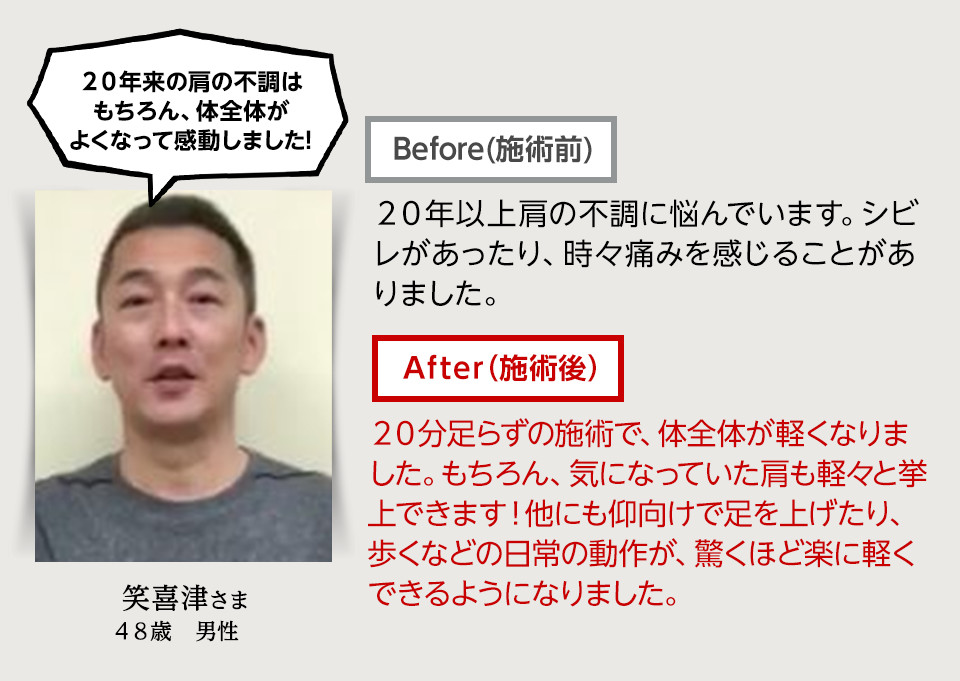 使えなくなっていた機能が瞬間的に回復するので、施術開始からグングン身体が変化していきます。